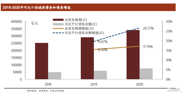 但2018年以后又出現(xiàn)了一些新問題。債券市場“違約潮”的出現(xiàn)引發(fā)了市場恐慌情緒,輕民企重國企、輕產(chǎn)業(yè)重城投理念的興起,市場投資者信用分層,抱團(tuán)投向城投平臺。下圖是可比公募債券和城投債的對比情況,2018—2019年債券增速明顯快于城投債務(wù)增速。