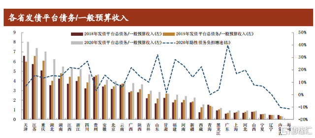 第二,債務(wù)負(fù)擔(dān)也是判斷區(qū)域債務(wù)風(fēng)險的重要維度。如果用發(fā)債平臺債務(wù)/一般預(yù)算收入來衡量債務(wù)負(fù)擔(dān),天津、江蘇、重慶、湖南、湖北、江西等地的負(fù)債壓力相對更重。對不同區(qū)域的政策著力點(diǎn)要有所區(qū)分。對于資源稟賦較差的企業(yè),可以采取資源支持、幫促產(chǎn)業(yè)轉(zhuǎn)型、盤活國企資產(chǎn)等方式化解風(fēng)險。而對于債務(wù)負(fù)擔(dān)較重的地區(qū),則應(yīng)先調(diào)整債務(wù)結(jié)構(gòu)、控制債務(wù)增速。