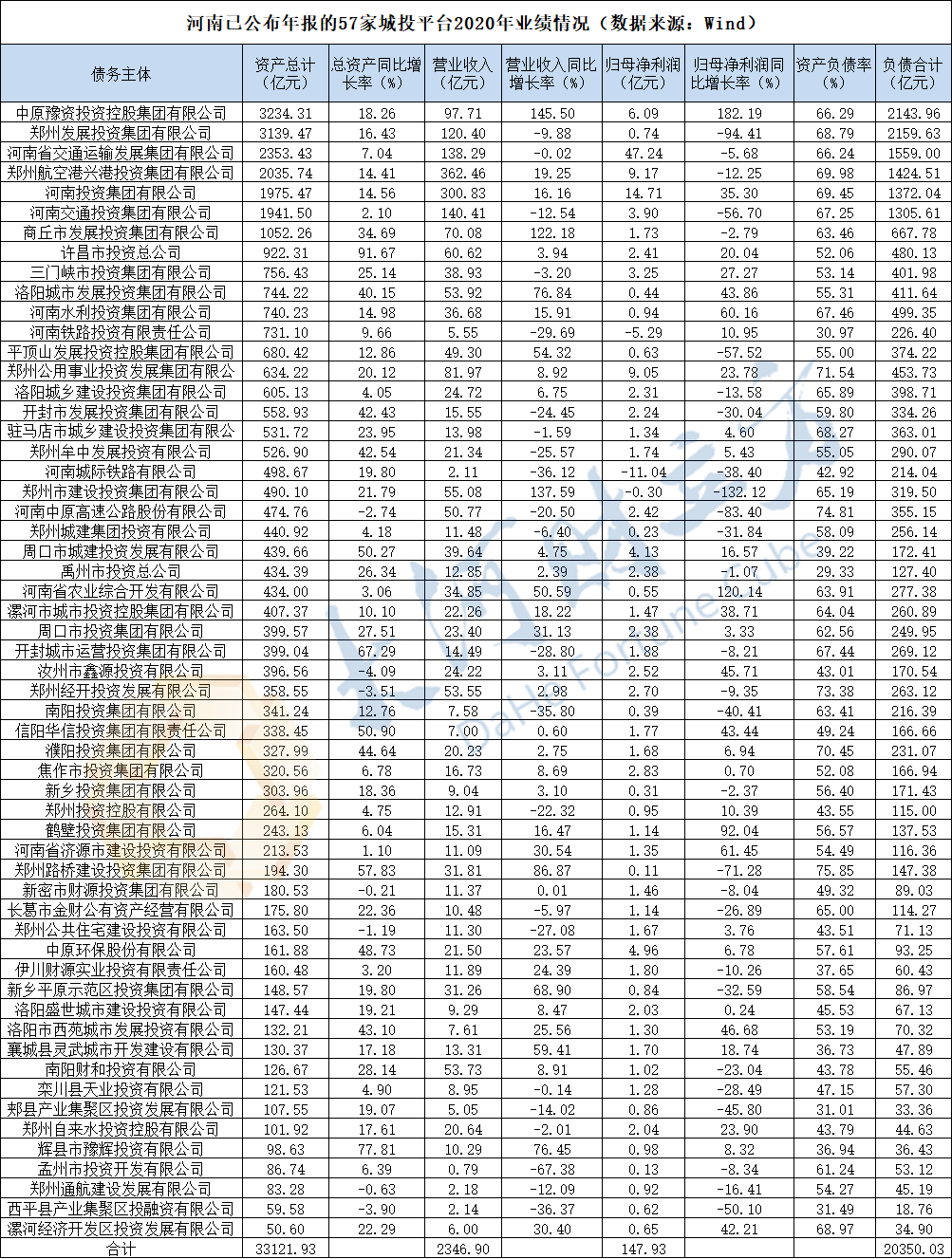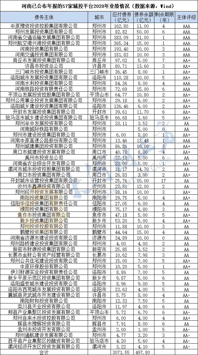 據(jù)Wind統(tǒng)計(jì),目前河南已公布年報(bào)的城投平臺(tái)共57家(其中河南省豫資城鄉(xiāng)一體化建設(shè)發(fā)展有限公司為中原豫資的全資子公司,暫未計(jì)算在內(nèi))。