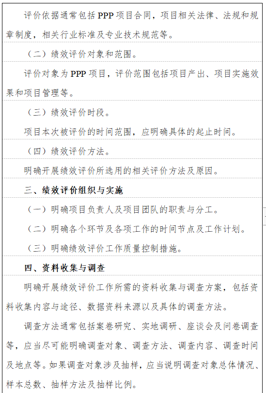 (二)制定績(jī)效評(píng)價(jià)工作方案。項(xiàng)目實(shí)施機(jī)構(gòu)應(yīng)根據(jù)政策要求及項(xiàng)目實(shí)際組織編制績(jī)效評(píng)價(jià)工作方案,內(nèi)容通常包括項(xiàng)目基本情況、績(jī)效目標(biāo)和指標(biāo)體系、評(píng)價(jià)目的和依據(jù)、評(píng)價(jià)對(duì)象和范圍、評(píng)價(jià)方法、組織與實(shí)施計(jì)劃、資料收集與調(diào)查等。項(xiàng)目實(shí)施機(jī)構(gòu)應(yīng)組織專家對(duì)項(xiàng)目建設(shè)期、運(yùn)營(yíng)期首次及移交完成后績(jī)效評(píng)價(jià)工作方案進(jìn)行評(píng)審。