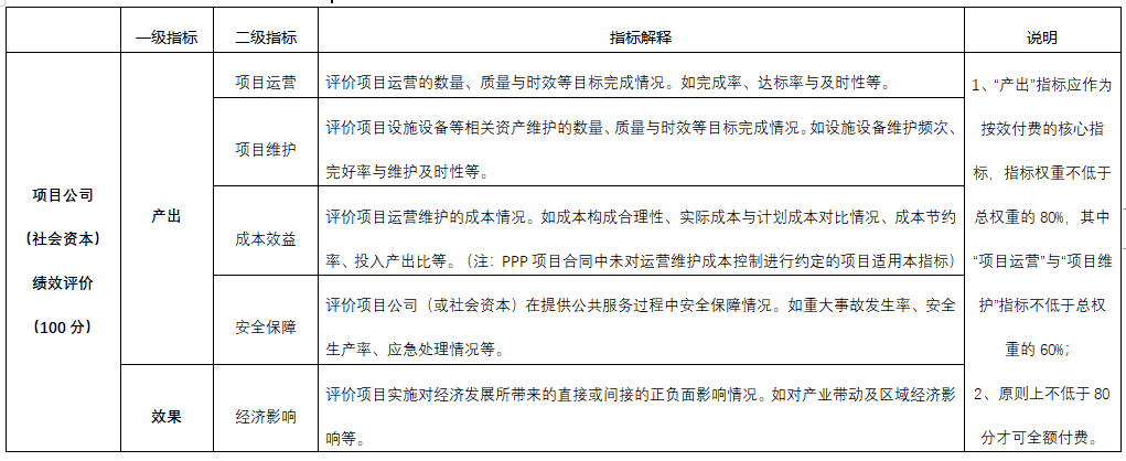 第十條 PPP項(xiàng)目績(jī)效指標(biāo)體系由績(jī)效指標(biāo)、指標(biāo)解釋、指標(biāo)權(quán)重、數(shù)據(jù)來源、評(píng)價(jià)標(biāo)準(zhǔn)與評(píng)分方法構(gòu)成。