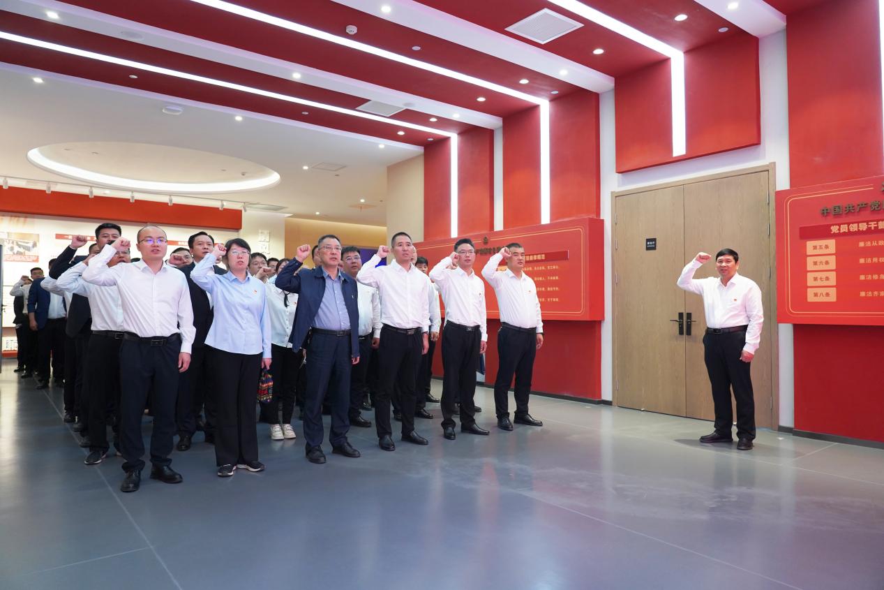 在鮮紅的黨旗下,全體人員在黨委委員、紀委書記韓玉奇的帶領(lǐng)下莊嚴肅立、高舉右手,重溫入黨誓詞,銘記入黨初心。