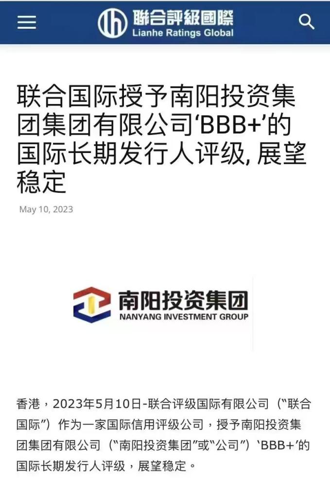 5月10日,經(jīng)聯(lián)合評(píng)級(jí)國(guó)際有限公司評(píng)定:授予南陽(yáng)投資集團(tuán)有限公司“BBB+”的國(guó)際長(zhǎng)期發(fā)行人評(píng)級(jí),展望穩(wěn)定。