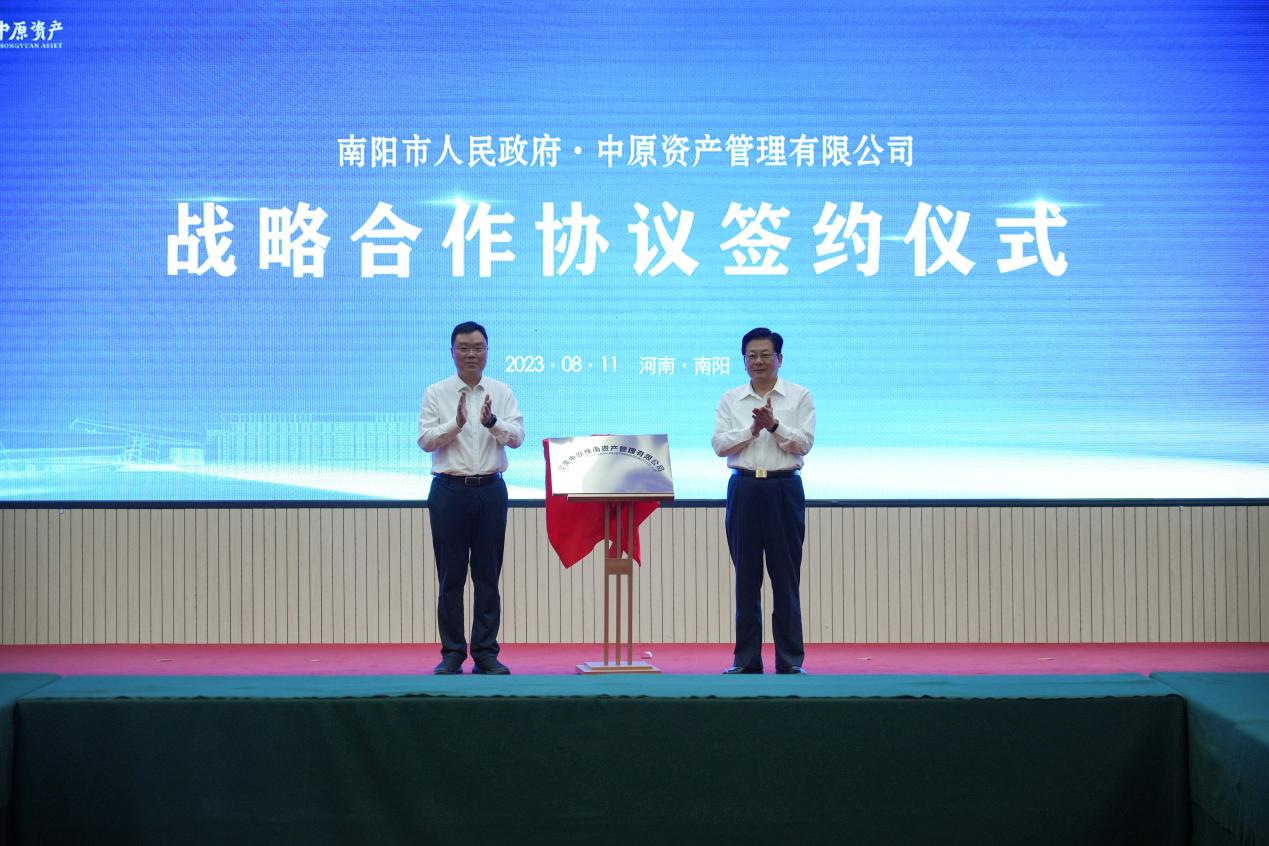8月11日下午,南陽市委書記朱是西和中原資產(chǎn)管理有限公司黨委書記、董事長李明共同出席,為中原資產(chǎn)管理有限公司與南陽投資集團合資成立的河南中原豫南資產(chǎn)管理有限公司進行揭牌。