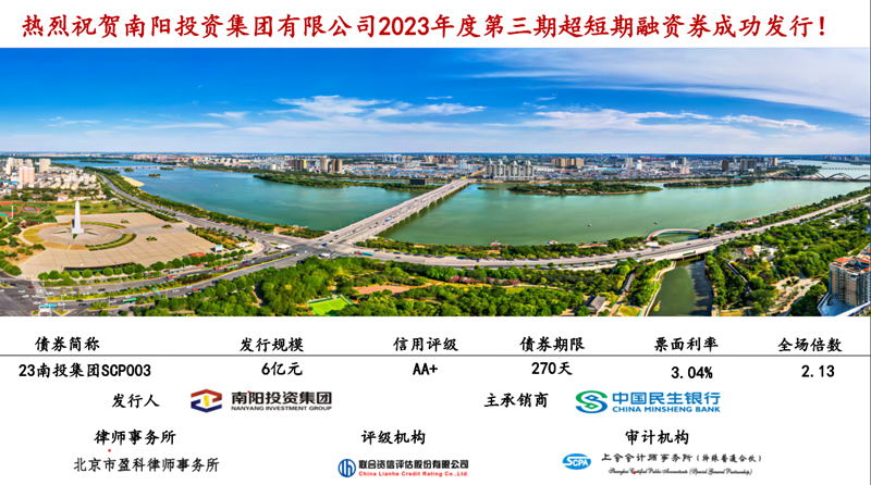 南陽投資集團(tuán)2023年度第三期超短期融資券(23南投集團(tuán)SCP003)于2023年9月26日成功發(fā)行,金額6億元,票面利率3.04%,全場(chǎng)倍數(shù)2.13倍,由民生銀行承銷,創(chuàng)2023年下半年河南省同評(píng)級(jí)同期限城投類企業(yè)發(fā)行價(jià)格新低!