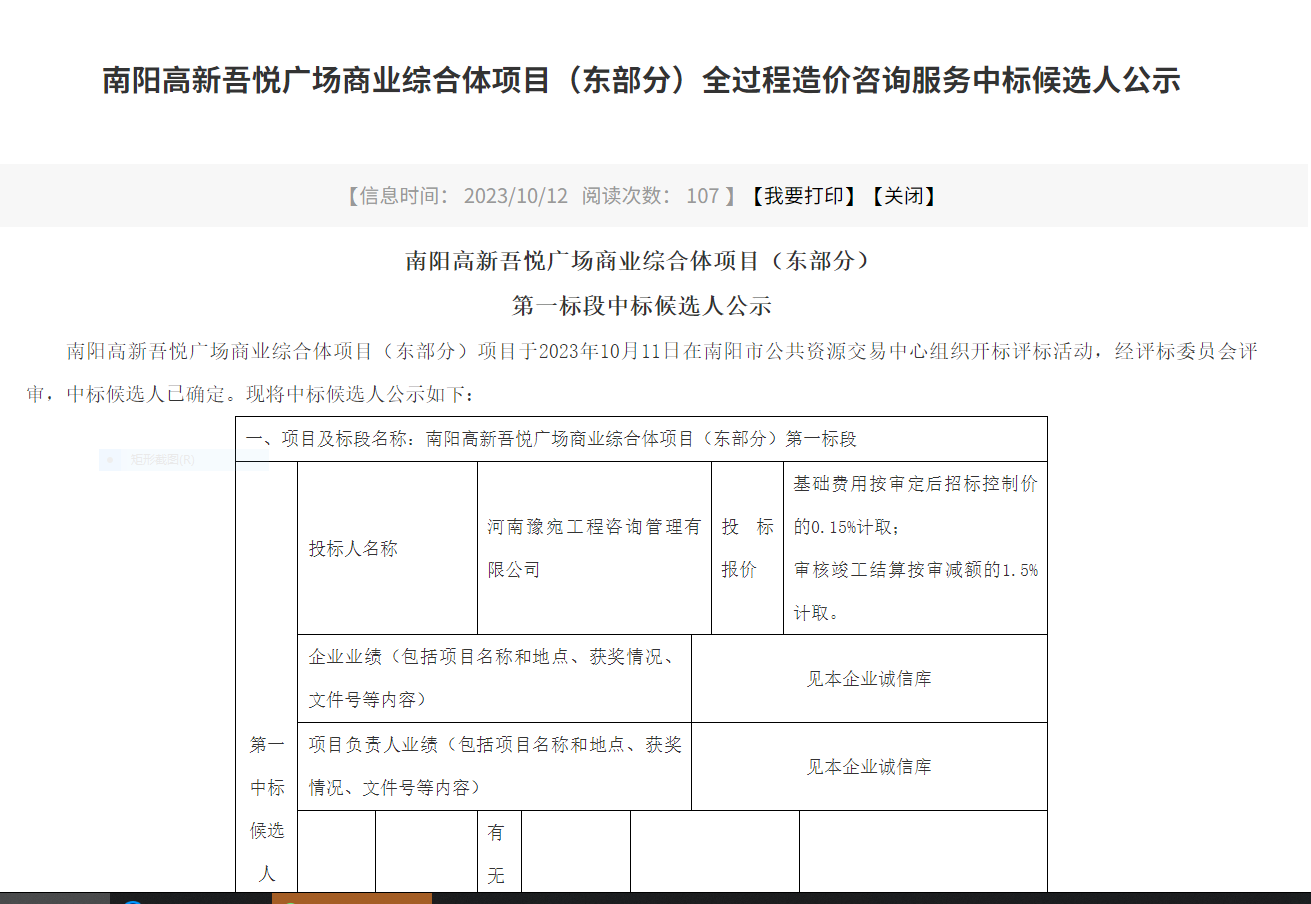 近日,南陽市建設(shè)投資有限公司下屬子公司河南豫宛工程咨詢管理有限公司成功中標(biāo)南陽高新吾悅廣場商業(yè)綜合體項(xiàng)目(東部分)全過程造價咨詢服務(wù)。