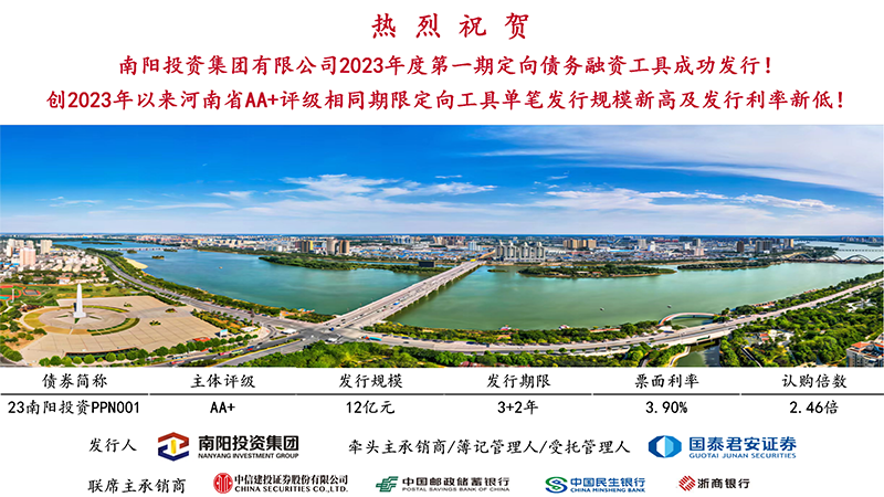 10月26日,南陽(yáng)投資集團(tuán)2023年第一期定向融資工具(23南投集團(tuán)PPN001)成功發(fā)行,金額12億元,期限3+2年,票面利率3.90%,全場(chǎng)倍數(shù)2.46倍,聯(lián)席主承銷(xiāo)商為國(guó)泰君安證券、中信建投證券、郵儲(chǔ)銀行、民生銀行、浙商銀行,創(chuàng)2023年以來(lái)河南省AA+評(píng)級(jí)相同期限定向工具單筆發(fā)行規(guī)模新高及發(fā)行利率新低!