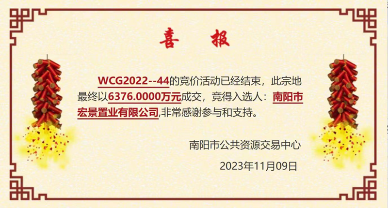 11月9日上午,南陽(yáng)投資集團(tuán)下屬子公司南陽(yáng)市宏景置業(yè)有限公司以6376萬(wàn)元的價(jià)格成功摘得伏牛路以東、規(guī)劃區(qū)間路以南WCG2022-44地塊,這是繼宏景·豐和苑、宏景·豐實(shí)苑之后的又一次重磅拓新,熱土之上,必將再創(chuàng)傳奇!