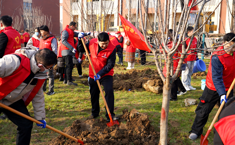 添下一抹新綠,播種一份希望。植樹現(xiàn)場,黨員同志們齊心協(xié)力、分工協(xié)作、熱情高漲,或兩人一組,或三五合作,放苗、扶正、培土、壓實,銜接有序,配合默契,呈現(xiàn)出一派熱火朝天的景象。經(jīng)過大家的共同努力,一排排新栽植的樹苗迎風(fēng)挺立,為市一中新校區(qū)增添了一抹新“綠”,成為一道亮麗的風(fēng)景線。