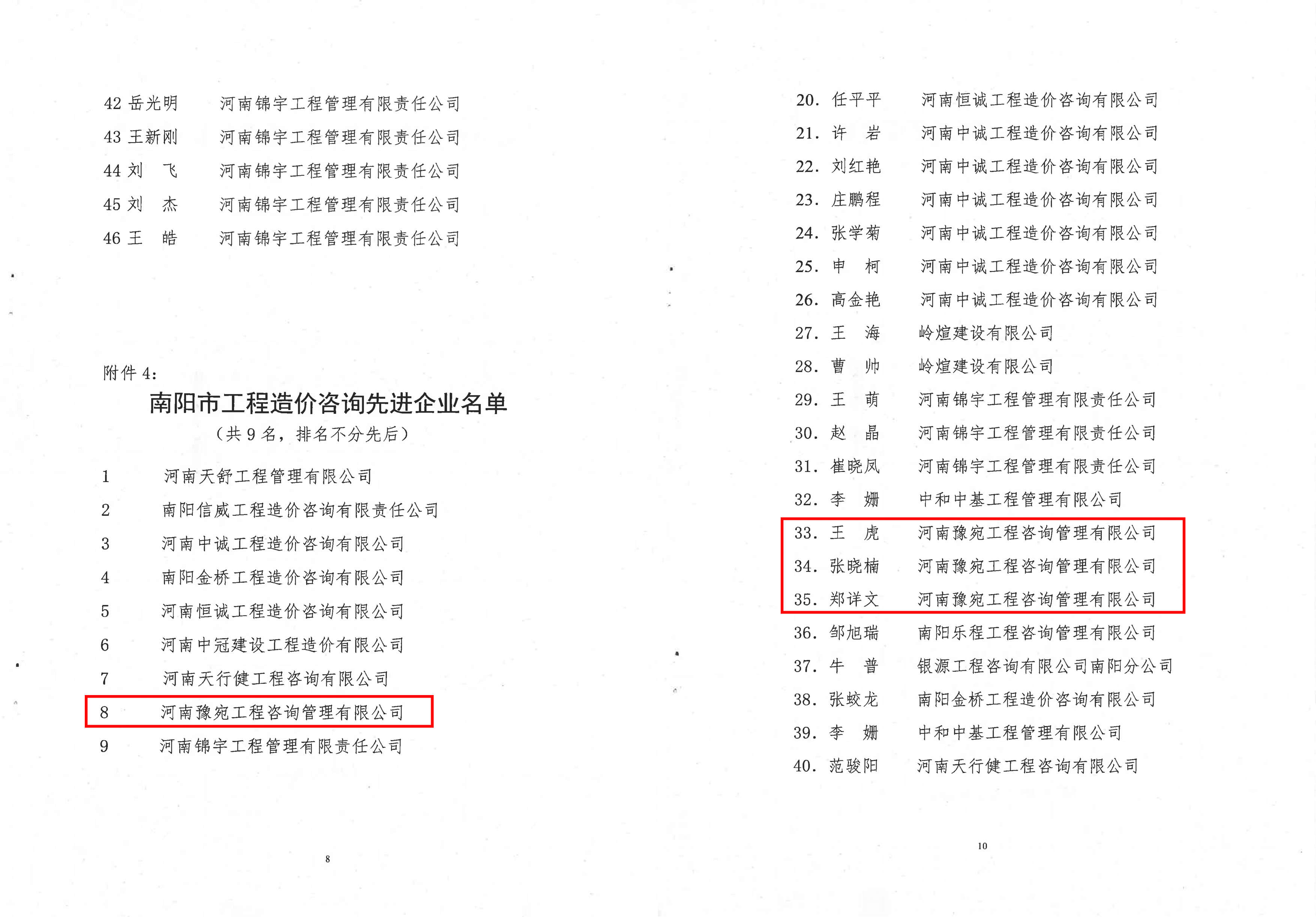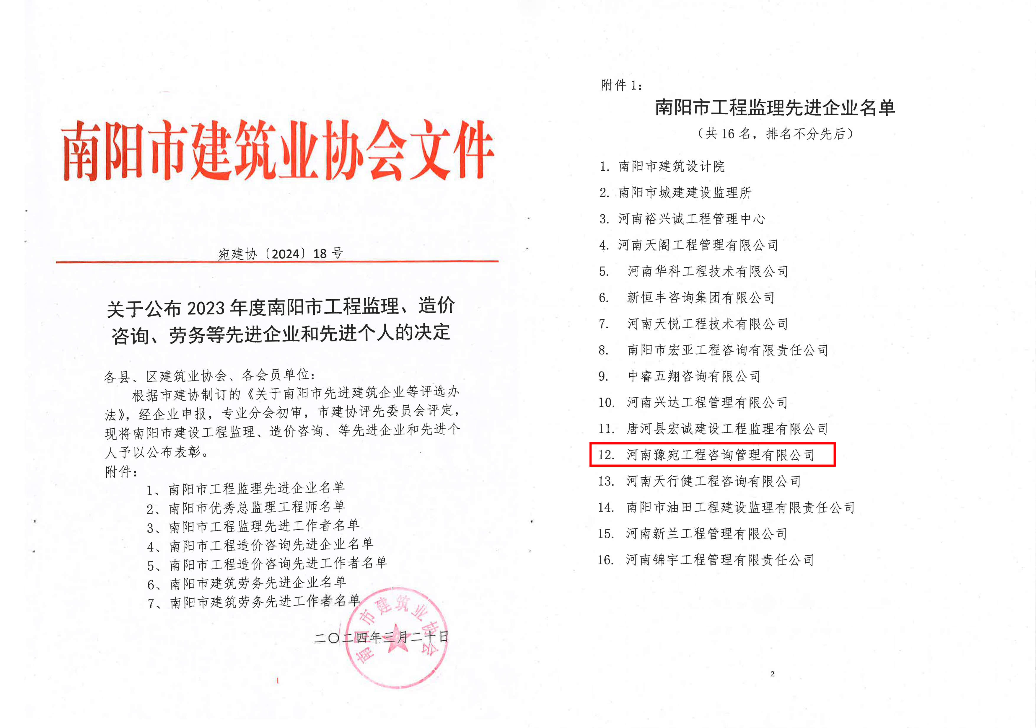 3月25日,南陽市建筑業(yè)協(xié)會召開第六屆第二次會員大會,會議公布并表彰了2023年度南陽市工程監(jiān)理、造價咨詢、勞務(wù)等先進(jìn)企業(yè)和先進(jìn)個人,集團下屬河南豫宛工程咨詢管理有限公司(簡稱:豫宛咨詢公司)榮獲南陽市建筑業(yè)協(xié)會頒發(fā)的“2023年度南陽市工程造價咨詢先進(jìn)企業(yè)”和“2023年度南陽市工程監(jiān)理先進(jìn)企業(yè)”兩項殊榮,公司員工王虎、張曉楠、鄭詳文3人獲得“2023年度南陽市工程造價咨詢先進(jìn)工作者”榮譽稱號。