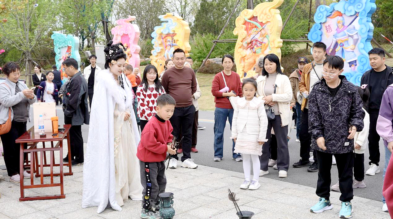 羅衣何飄飄,輕裾隨風(fēng)還,“十二花神”迎春風(fēng)而舞,引來觀眾陣陣掌聲深受熱捧;非遺茶百戲、貼花鈿、漢婚大典、簪百花、器樂演奏等特色傳統(tǒng)活動(dòng),讓眾人感受到國(guó)風(fēng)美學(xué)的別樣魅力;園區(qū)特別設(shè)置與十二花仙游戲互動(dòng)的《龍崗百花譜》,使游客沉浸式體驗(yàn)NPC集章打卡的樂趣;十二位賣花郎,背簍提籃,呼朋伴友,與春同行,邀游客共赴這一場(chǎng)春日之約。