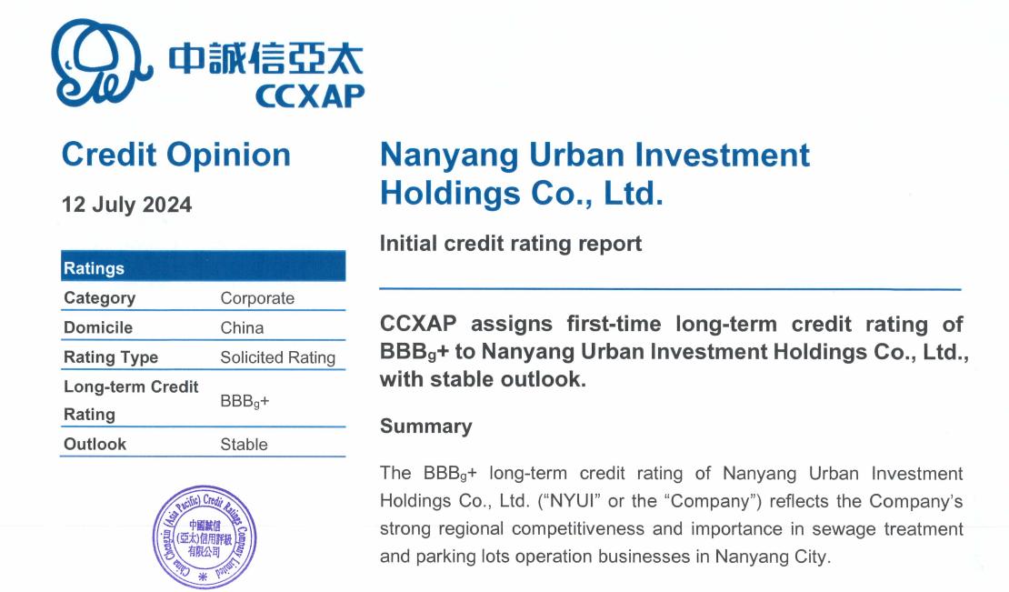 2024年7月12日,境外權威國際信用評級機構中國誠信(亞太)信用評級有限公司(以下簡稱:中誠信亞太)首次授予南陽城投控股有限公司(以下簡稱:南陽城投控股)“BBBg+”國際長期發(fā)行人評級,展望穩(wěn)定。