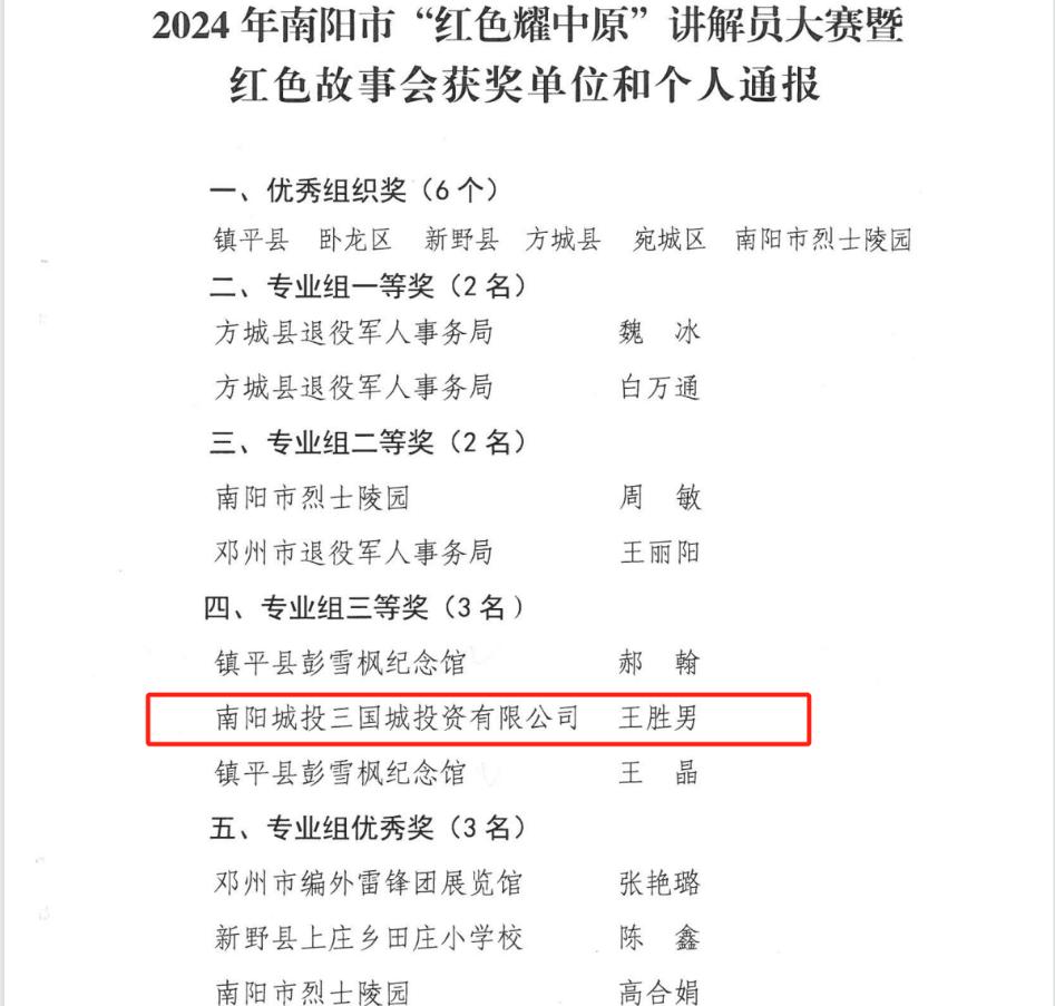 近日,三國(guó)城公司雙喜臨門(mén),捷報(bào)頻傳,在多項(xiàng)評(píng)選中脫穎而出,接連榮獲“南陽(yáng)市第二屆工銀杯‘紅色耀中原’講解員大賽暨紅色故事會(huì)”三等獎(jiǎng)以及“點(diǎn)亮河南文旅新場(chǎng)景·優(yōu)秀景區(qū)”兩項(xiàng)榮譽(yù)獎(jiǎng)項(xiàng)。