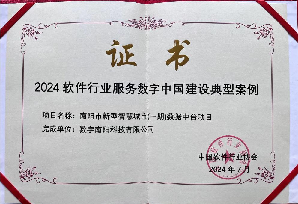 近日,數(shù)字南陽科技有限公司新型智慧城市(一期)數(shù)據(jù)中臺項目榮獲中國軟件行業(yè)協(xié)會頒發(fā)的“2024年軟件行業(yè)服務數(shù)字中國建設典型案例”榮譽證書。
