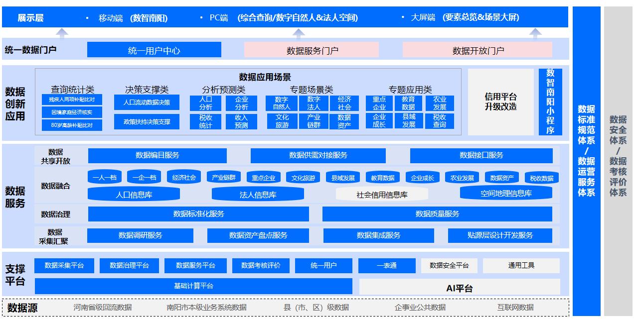 南陽市新型智慧城市(一期)數(shù)據(jù)中臺項目是我市響應數(shù)字政府、智慧城市建設的重要戰(zhàn)略部署,不僅是全市政務大數(shù)據(jù)平臺的核心,也是全市數(shù)字政府和新型智慧城市建設發(fā)展需要的數(shù)字底座和數(shù)字引擎。該項目主要負責數(shù)據(jù)的采集、匯聚、治理、共享、開放存儲與服務,通過多維聚數(shù),初步實現(xiàn)跨部門、跨層級的數(shù)據(jù)匯聚與共享,使數(shù)據(jù)互聯(lián)互通,以數(shù)賦能,充分挖掘和釋放政務數(shù)據(jù)價值,流程“智”造服務民生;致力于數(shù)據(jù)的不斷匯聚、高質(zhì)量治理供給和多場景應用開發(fā),形成實時更新的全域數(shù)據(jù)資源體系和應用體系,建立“用數(shù)據(jù)對話、用數(shù)據(jù)決策、用數(shù)據(jù)服務、用數(shù)據(jù)創(chuàng)新”的治理機制,把數(shù)據(jù)聚起來、管起來、存起來,讓數(shù)據(jù)活起來、動起來、用起來。