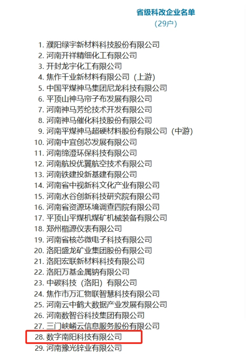 近日,省政府國資委印發(fā)《關(guān)于公布省級(jí)科改企業(yè)和專精特新星變計(jì)劃企業(yè)名單的通知》,河南省首批共有29戶省級(jí)科改企業(yè)和50戶專精特新星變計(jì)劃企業(yè)入選。其中,數(shù)字南陽科技有限公司入選省級(jí)科改企業(yè)名單。