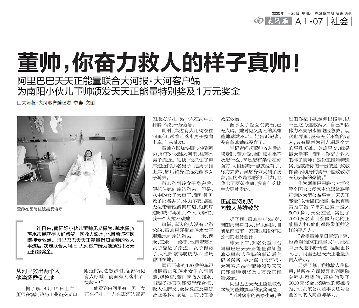 2020年4月19日,濱河路與工業(yè)路交叉口附近的河邊一男一女落水,散步路過的董帥不顧個(gè)人安危,挺身而出,以一己之力連救兩人,自己卻因體力不支溺水被送醫(yī)急救,因多器官功能障礙綜合征、吸入性肺炎、全身炎癥反應(yīng)綜合征等多項(xiàng)病癥在醫(yī)院治療十余日。2021年12月,董帥被臥龍區(qū)授予“見義勇為”榮譽(yù)稱號(hào)。