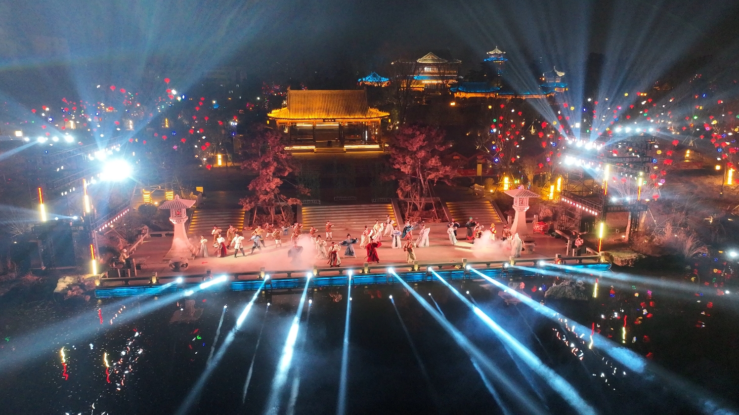 廟會期間,17個點位32個節(jié)目,每天80余場演出輪番上演。涵蓋民俗表演、漢風舞蹈、國潮音樂、原創(chuàng)情景劇、非遺展示、互動演藝、燈光秀、水幕光影秀等表演,年味十足,精彩紛呈。兩個漢風市集近300個攤位,匯集品牌、小吃、非遺、文創(chuàng)、兒童娛樂等,可滿足不同游客需求。