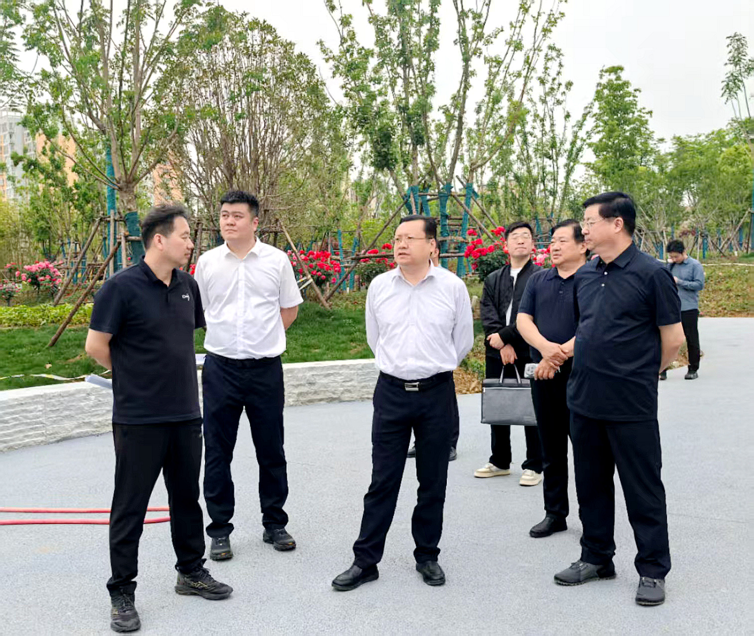 春日的百里奚文化園青草茵茵、月季花盛開,施工現(xiàn)場機(jī)器轟鳴、人員忙碌,正在爭分奪秒全速推進(jìn)項目收尾工作。張軒一行深入園區(qū),細(xì)致查看了園內(nèi)各功能區(qū)的進(jìn)度情況,了解了園區(qū)景觀布局、配套設(shè)施、施工細(xì)節(jié),詳細(xì)聽取了項目開園籌備情況,并現(xiàn)場對相關(guān)工作進(jìn)行安排部署。