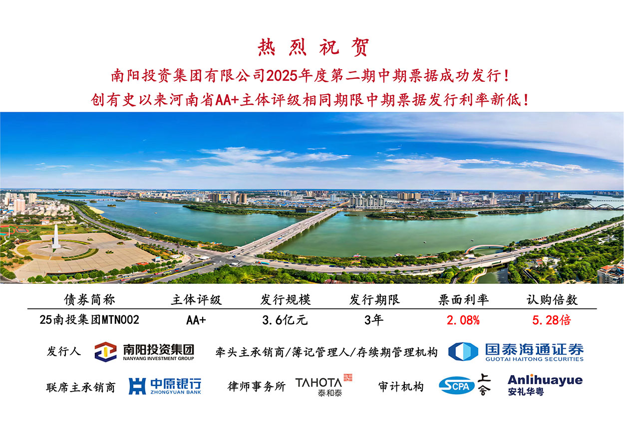 近日,南陽投資集團2025年度第二、三期中期票據在銀行間市場成功發(fā)行。債券規(guī)模分別為3.6億元、3億元,發(fā)行期限3年,票面利率分別為2.08%、2.05%,創(chuàng)有史以來河南省AA+主體評級相同期限中期票據發(fā)行利率新低!